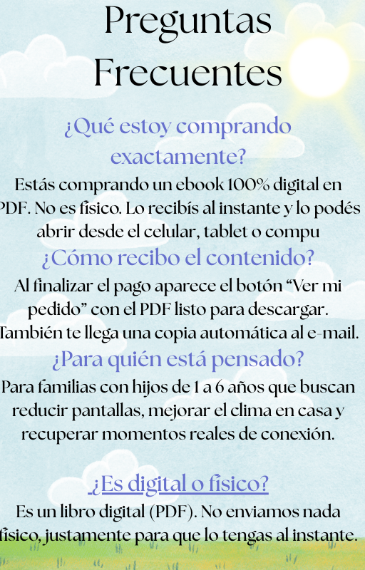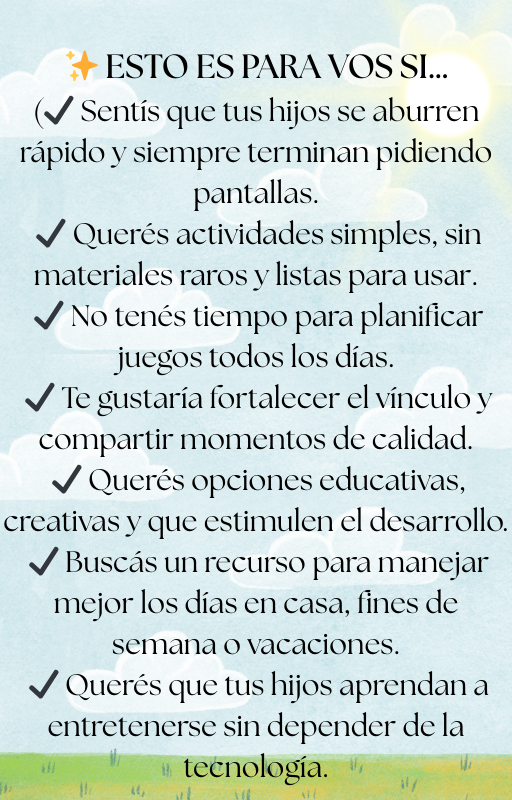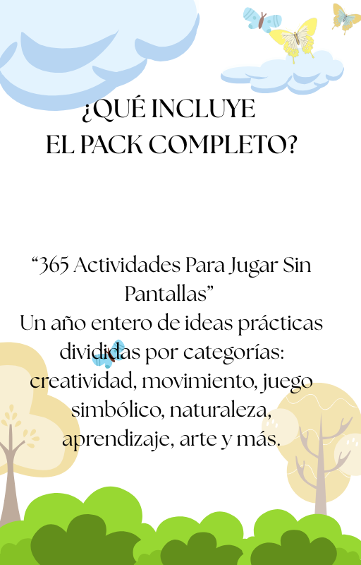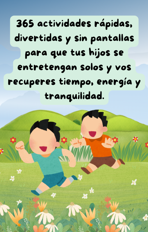 “365 Actividades para Jugar sin Pantallas” es un ebook pensado para familias que buscan alternativas simples y divertidas para acompañar a sus hijos sin depender de la tecnología.