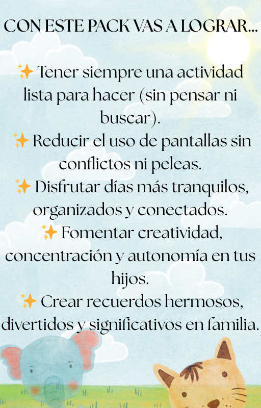 Incluye ideas listas para usar, diseñadas para estimular el juego, la creatividad y el aprendizaje, incluso en los días con poco tiempo o cero planificación.